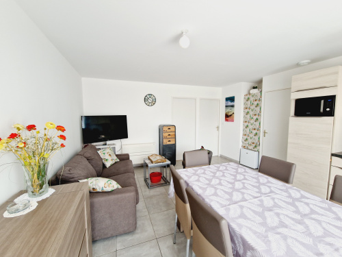 Détendez-vous dans la pièce de vie qui se compose d'un salon-séjour cosy avec canapé, télévision, connexion WIFI et d'une cuisine ouverte équipée et aménagée : four, réfrigérateur/congélateur, lave-vaisselle, micro-ondes, petits électroménagers (cafetière, grille pain, bouilloire...).
